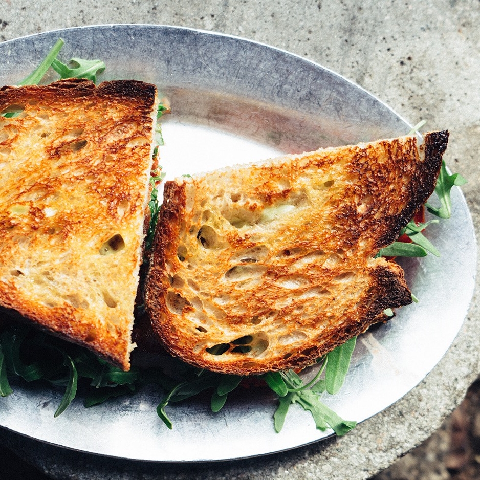 La Brea Bakery is pretty common in most grocery stores these days. They have a superb Raisin Pecan Bread that makes for a decadent panini. Grab two slices from the loaf and butter the sides that will be toasted in the pan.